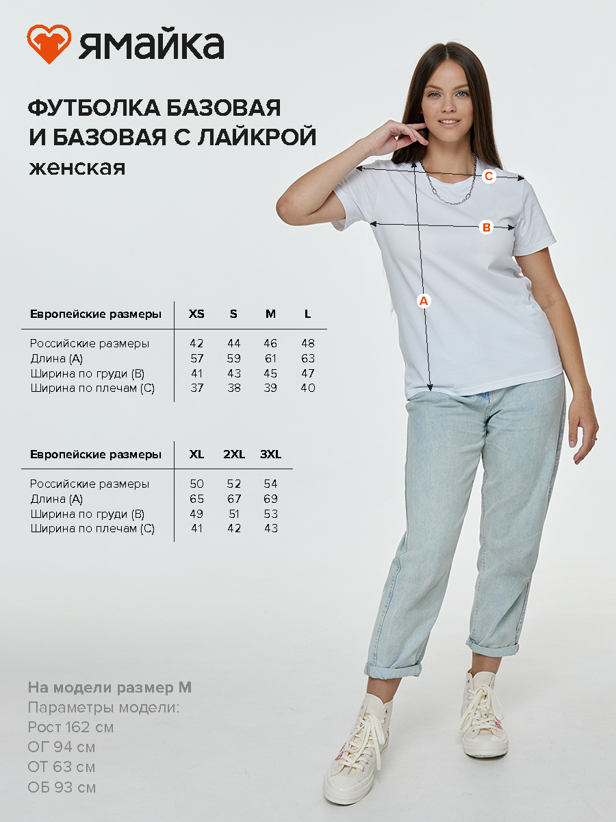 Футболка женская базовая с лайкрой из кулирной глади: в составе 95% хлопка и 5% лайкры. Плотность 165 г/м2. Прилегающий силуэт, короткий рукав и круглый воротник. Низ футболки и низ рукава обработаны швом в подгибку шириной в 2см. Горловина спинки обработана бейкой. Эластичность полотна улучшает посадку изделия на женской фигуре. Благодаря добавлению лайкры, изделие не деформируется после многочисленных стирок.