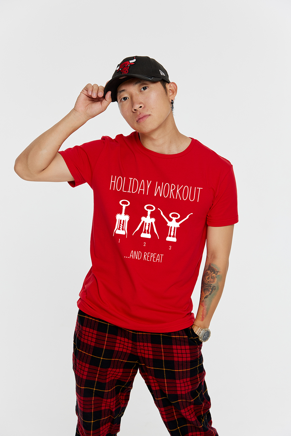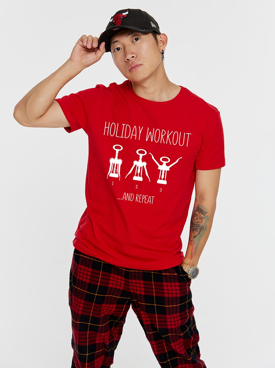 Футболка с принтом «Holiday Workout» — дизайн с яркой отсылкой к спортивной тематике, шутливо намекающий, что в новогодние праздники основные подходы делаются за праздничным столом.