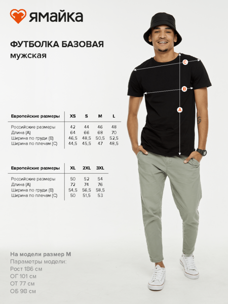 Футболка мужская базовая из кулирной глади: в составе 100% хлопка. Плотность 180г/м2. Прямой традиционный силуэт, короткий рукав и круглый воротник. Низ футболки и низ рукава обработаны швом в подгибку шириной в 2см. Крой обеспечивает комфорт и практичность.