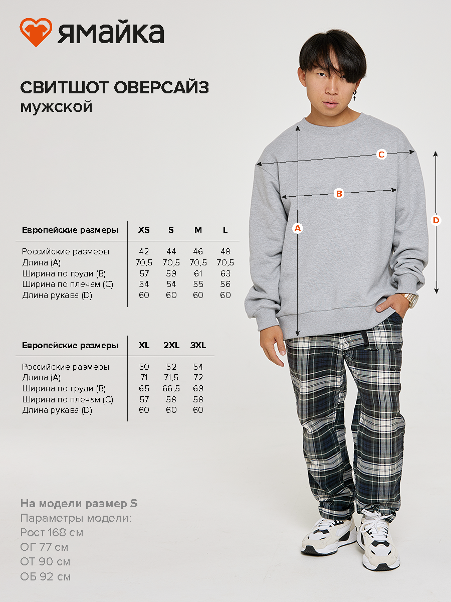 Свитшот оверсайз из качественного турецкого полотна (футер трёхнитка) с мягким велюром внутри: 100% хлопок. Плотность 350 г/м2. Объемный силуэт, слегка зауженный к низу. Конструкция со спущенным плечевым швом обеспечивает удобную посадку и не сковывает движений. Крой свитшота – мужской. Cвитшот размера М подойдет девушкам, носящим размер L/XL.