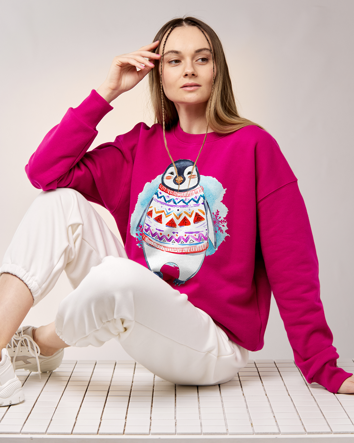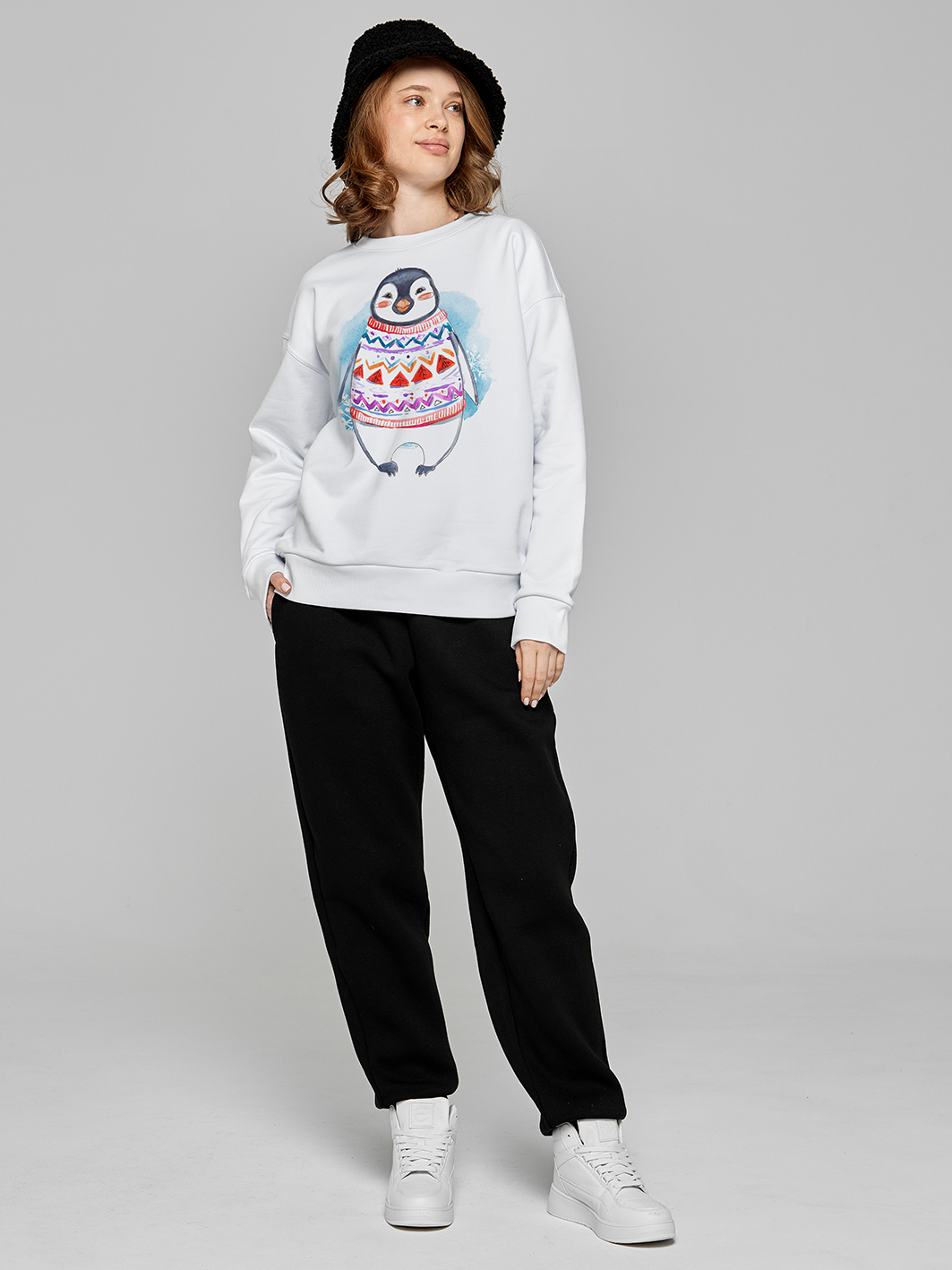 Ощутите магию зимней сказки в свитшоте, украшенном веселым новогодним принтом — милым пингвином. Этот свитшот не просто утеплит вас в холодные дни, но также добавит ощущение уюта и тихой радости. Принт в виде игривого пингвина создает вам и всем окружающим позитивное настроение.