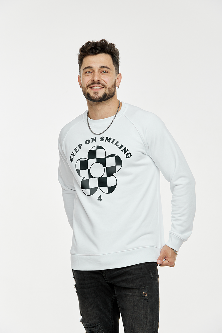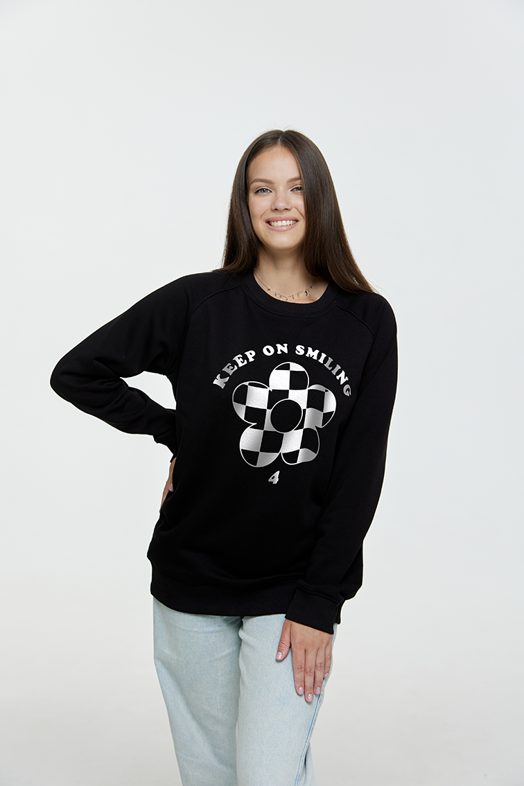 Свитшот из футера трёхнитки без начёса: 70% хлопок и 30% полиэстер. Плотность 350 г/м2. Прямой силуэт, пояс и манжеты рукавов выполнены из эластичной резинки. Круглая горловина обработана киперной лентой для защиты от растяжения. Особенность модели – рукав реглан. Рукав выкраивается вместе с плечевой частью изделия и пришивается к горловине. Конструкция со смещенным плечевым швом обеспечивает удобную посадку и не сковывает движений. Крой свитшота – унисекс, подходит как мужчинам, так и женщинам.