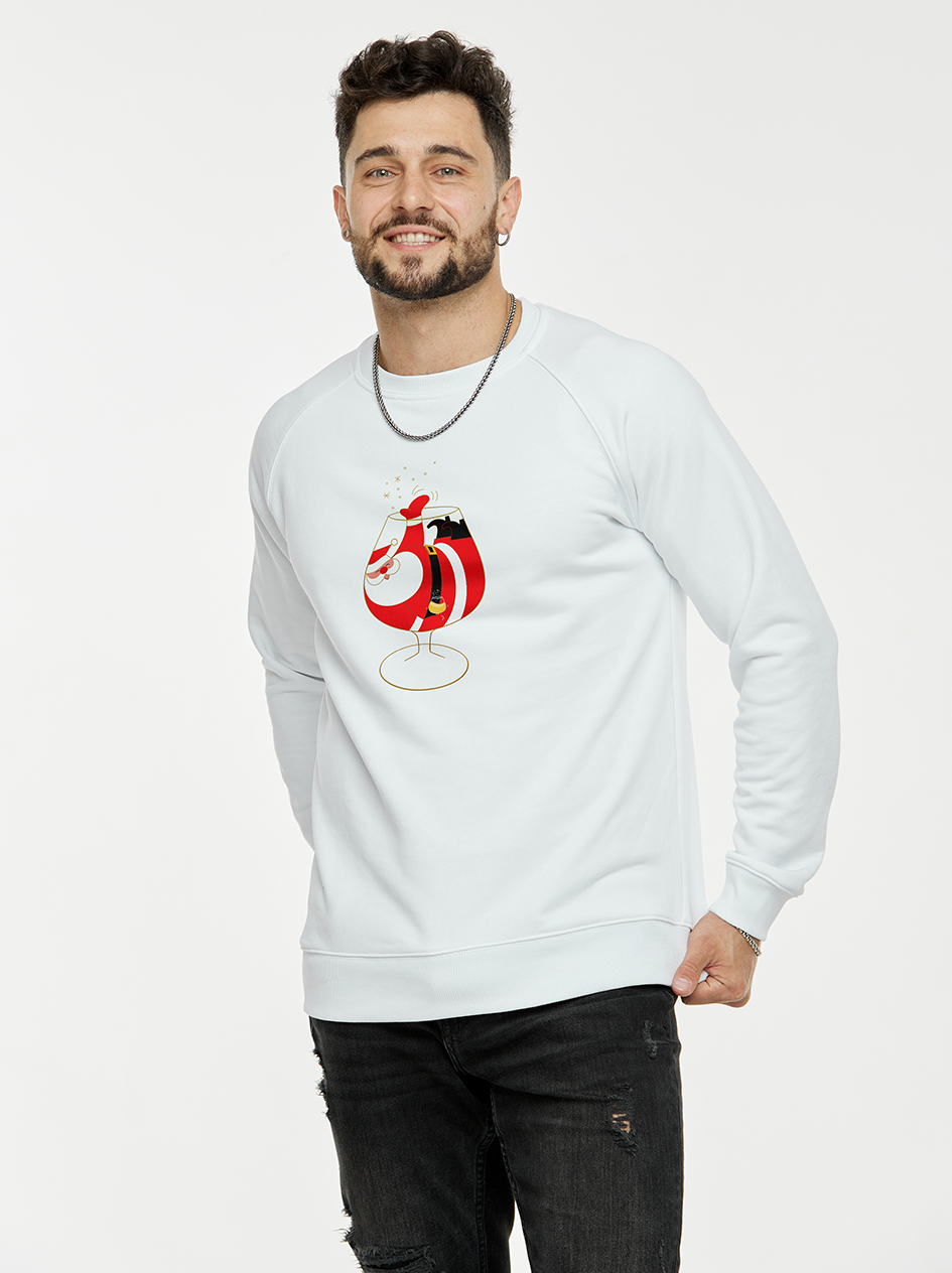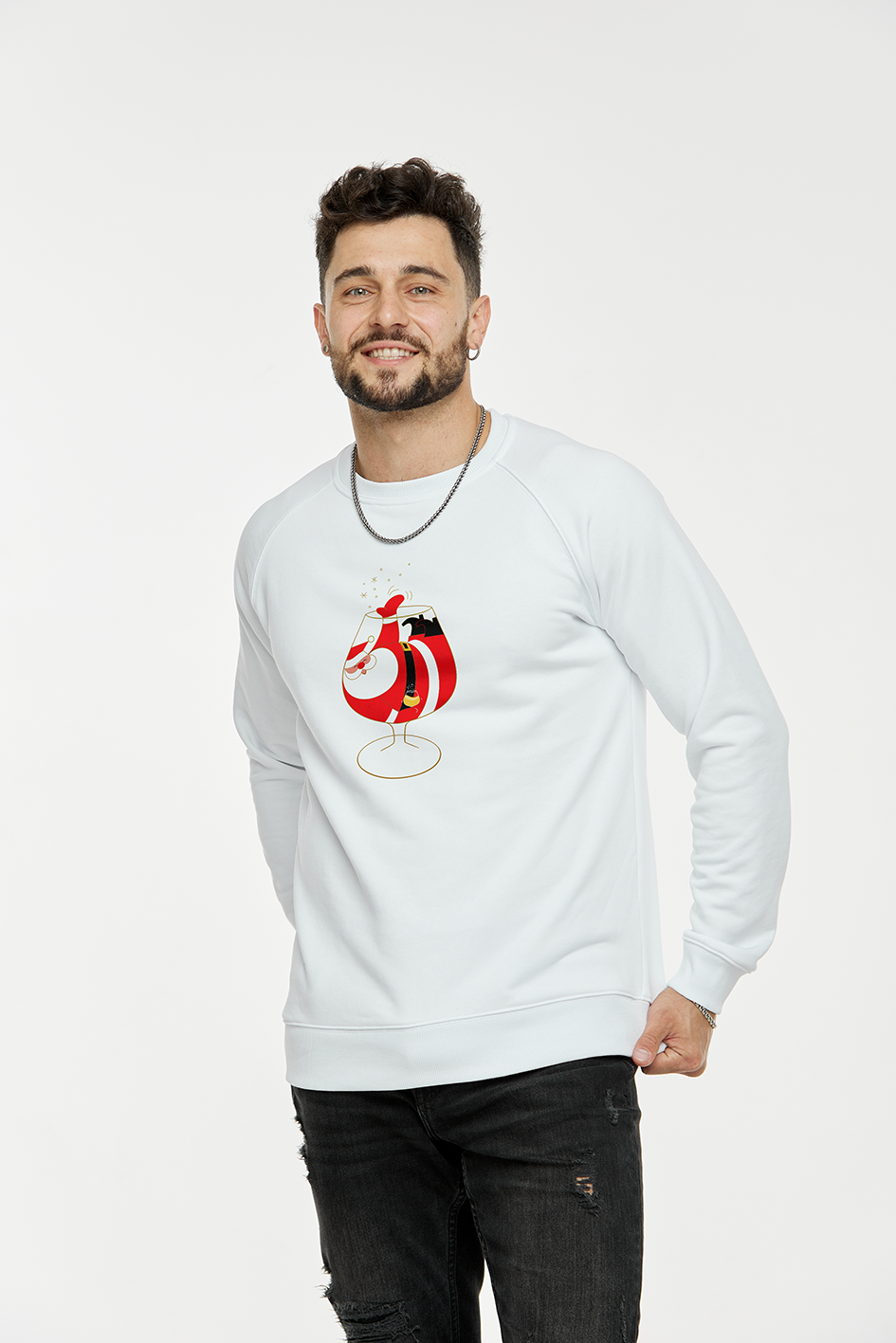 Свитшот новогодним принтом — Сантой, погруженным в веселое приключение внутри бокала, придаст вам праздничного настроения и духа авантуризма в новогоднюю ночь!