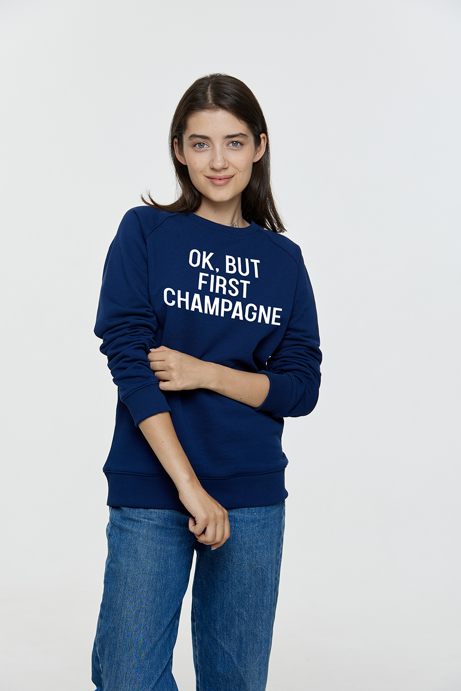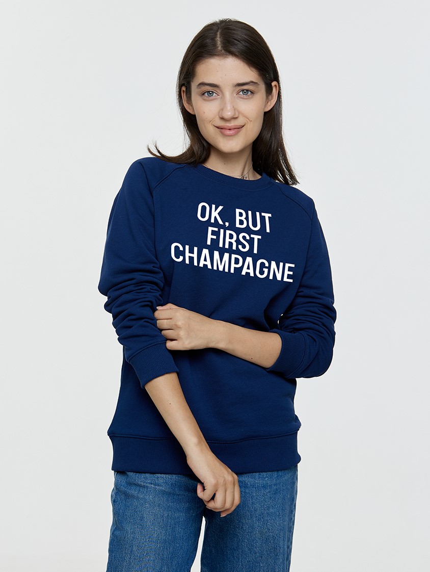 Очаровательный свитшот унисекс с веселым новогодним принтом «Сначала шампанское!» призван создать праздничное настроение и подчеркнуть вашу жажду веселья.