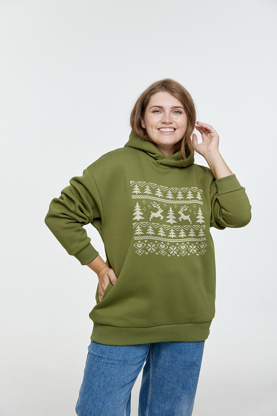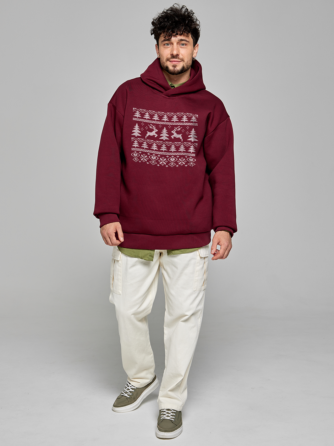Окутайте себя волшебством праздника в толстовке оверсайз ‘Олений орнамент’. Принт в виде белого орнамента, вдохновленного народными рождественскими узорами, добавит вашему образу уюта и тепла. Эта толстовка сочетает в себе дух народной традиции и стильный, современный дизайн. Орнамент, как на вязаных рождественских свитерах, добавит в ваш образ нотку ретро-шарма и создаст атмосферу уюта.